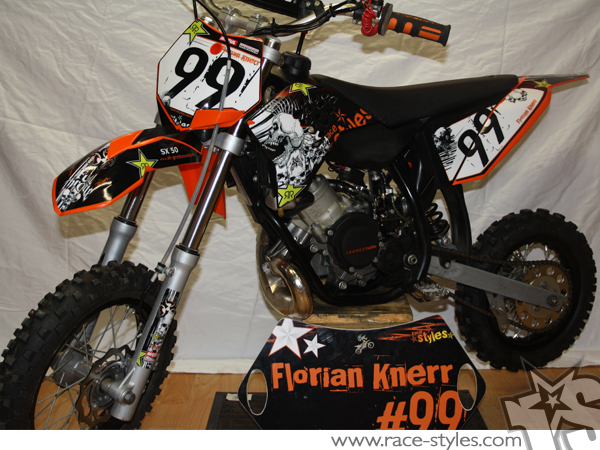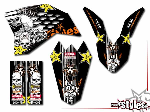 Beschreibung: Skull-FMX Basic Dekor-Kit passend für KTM SX50 2002-2015 / SX65 2000-2015 / SX85 2000-2012 bestehend aus Gabel li./re., Kotflügel vo./hi. und Kühler li./re.