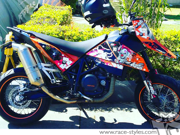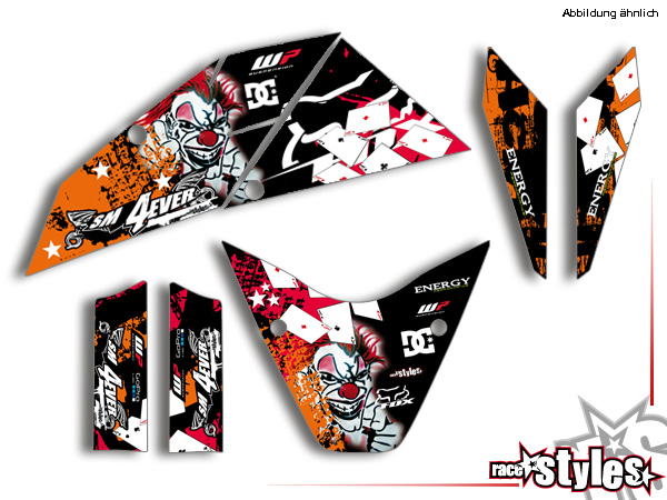 Description: basic graphic-kit for KTM Supermoto 690 R (2007-2010). This kit includes the following decals: fork protectors le./ri., fender front/rear and rad covers le./ri.