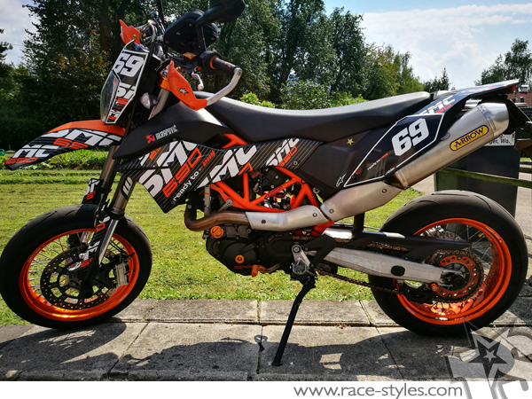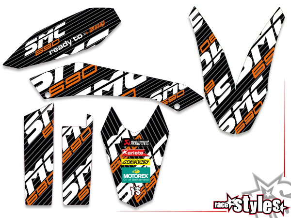 Description: basic graphic-kit for KTM 690 SMC / SMC-R / ENDURO (2008-2017). This kit includes the following decals: fork protectors le./ri., fender front/rear and rad covers le./ri.