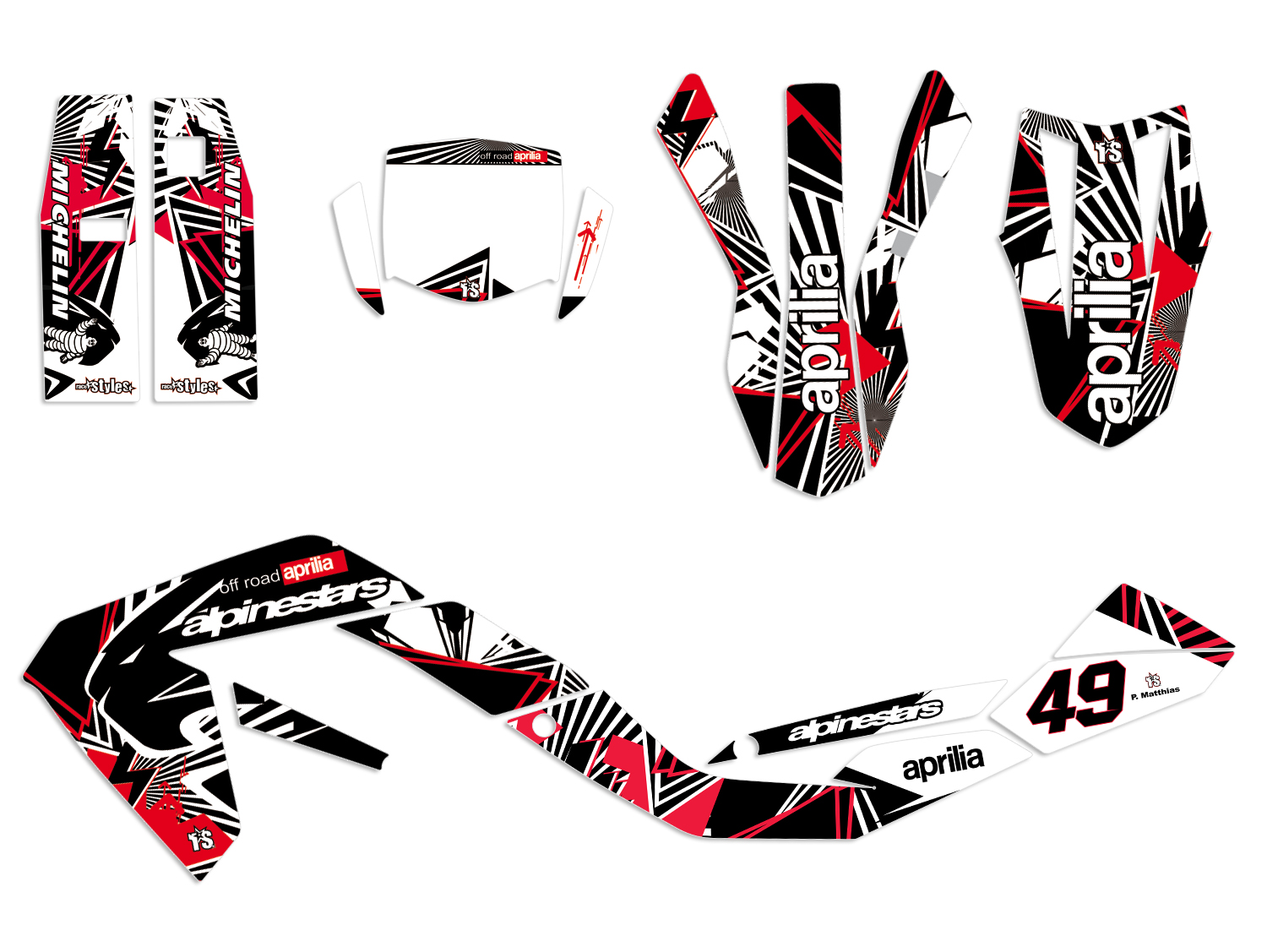 Description: Full decals kit for APRILIA SX / RX 50 - 125. This kit includes the following stickers: fork protectors le./ri., fender front/rear, rad covers le./ri., a full number plate kit and swingarm le./ri. in a STRIPES design.