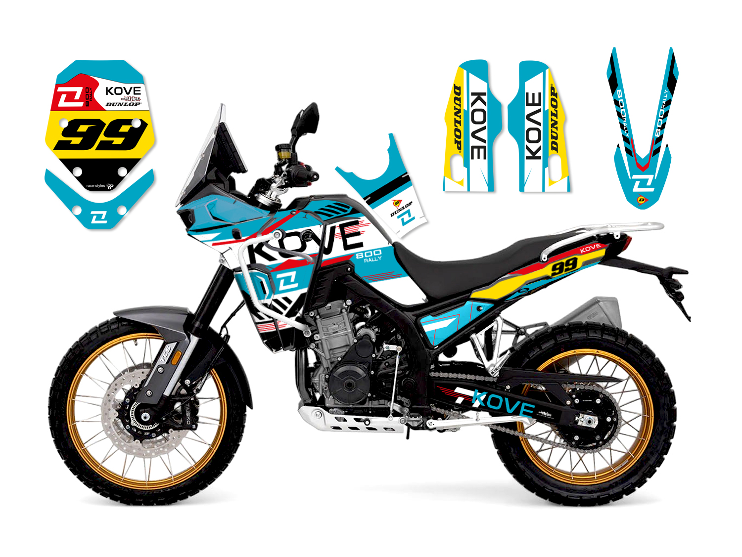 Description: Full decals kit for all KOVE 800 models. This kit includes the following stickers: fork protectors le./ri., fender front/rear, rad covers le./ri., a full number plate kit and swingarm le./ri. in a BlueStripes design.
