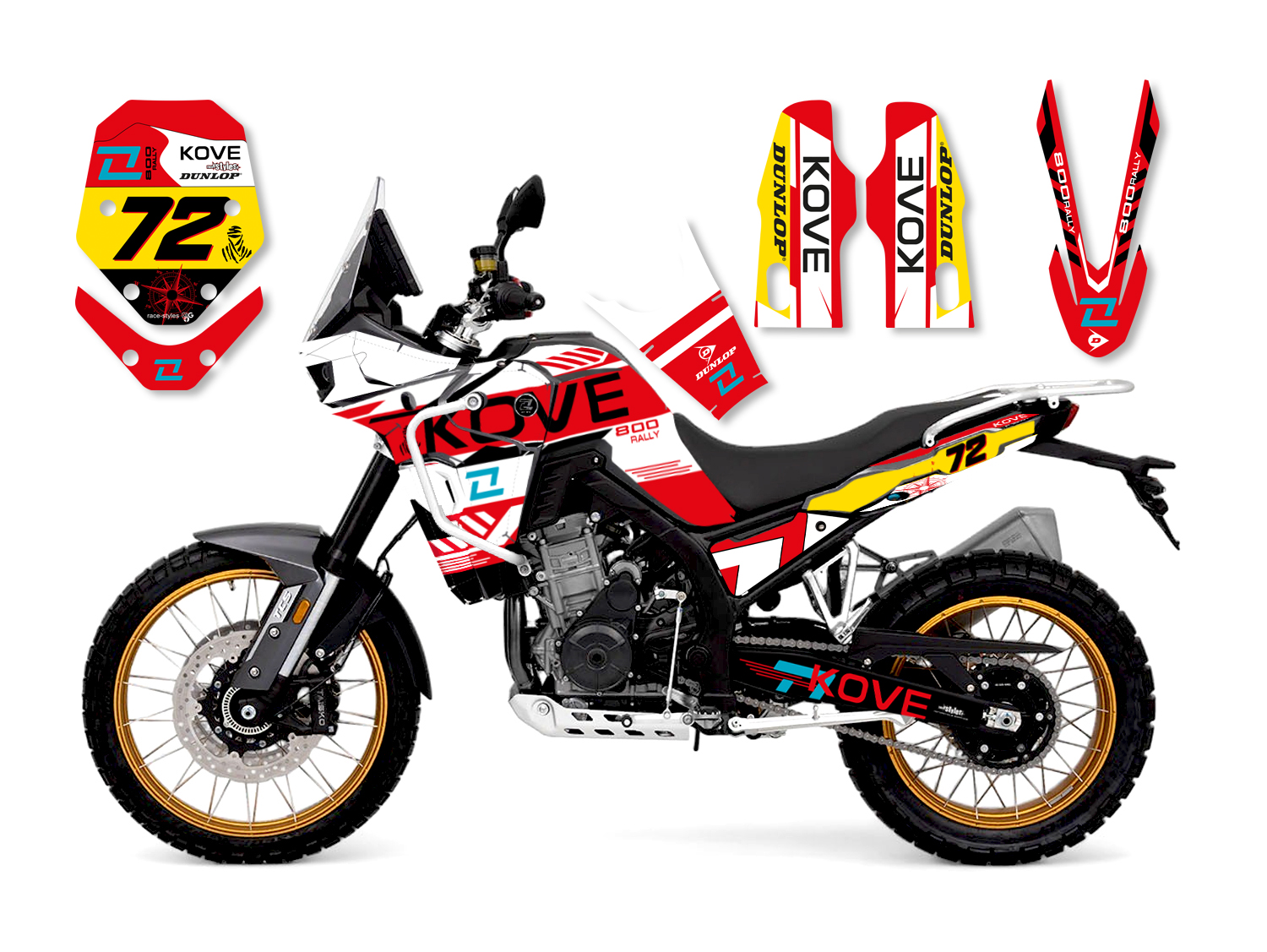 Description: Full decals kit for all KOVE 800 models. This kit includes the following stickers: fork protectors le./ri., fender front/rear, rad covers le./ri., a full number plate kit and swingarm le./ri. in a RedStripes design.