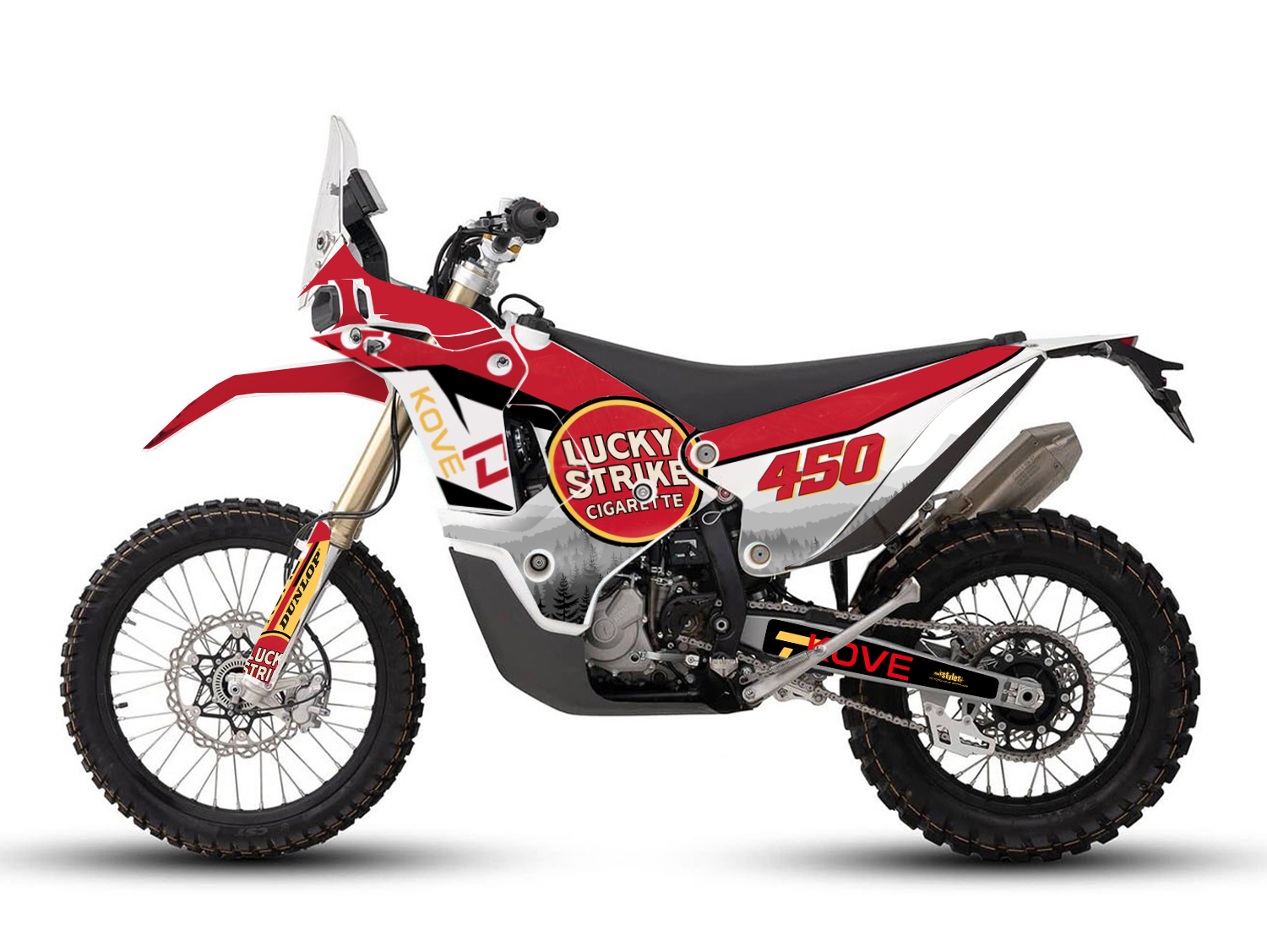 Beschreibung: Komplettes Dekor passend für alle KOVE 450 bestehend aus Gabel li./re., Kühlerspoiler li./re., Kotflügel vo./hi., Startnummernfelder- und Schwingen-Kit Aufkleber im Design LuckyStrike.