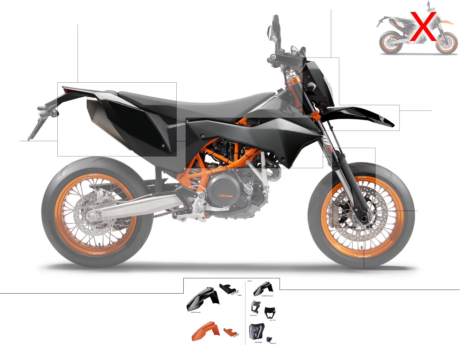 The unique black reSTYLE plastic kit suitable KTM SMC 690 / ENDURO 690 (2012-2017), consits of: