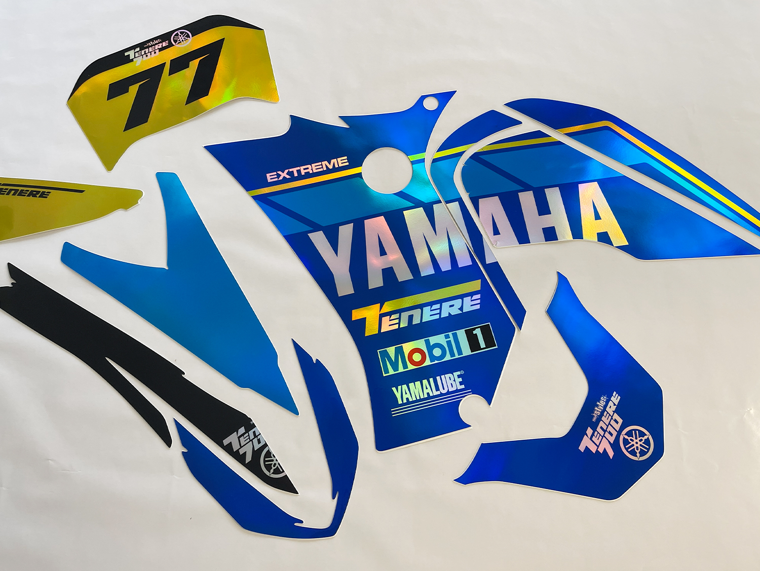 Full graphic for YAMAHA Tenere 700, 2019-2024. This offroad-HOLOGRAM-GLOSSY graphic kit will be delivered as shown! No changes (name/number) are possible.